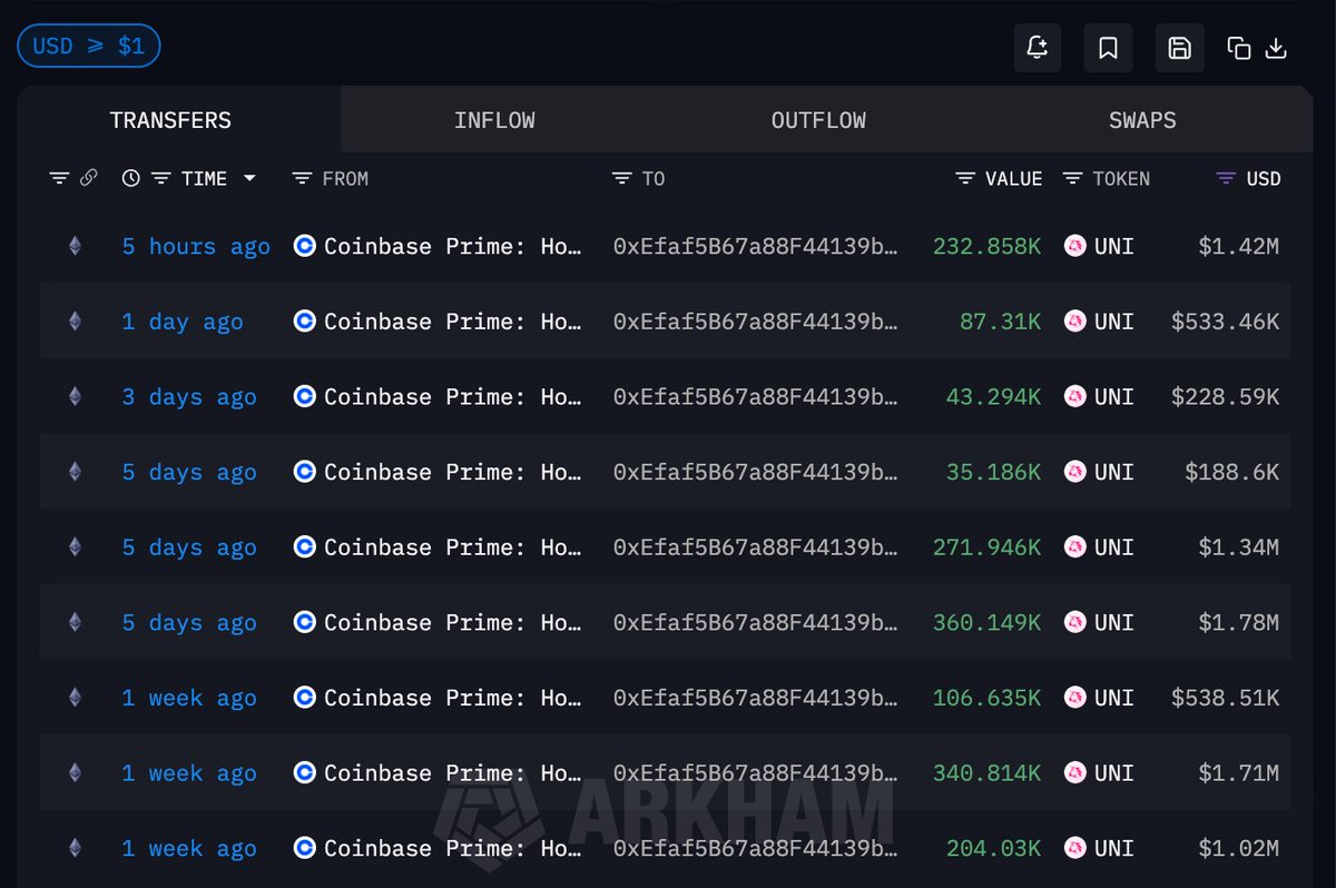 他在 12.15-12.23 期间从 #Coinbase 累计提出 1,682,220 枚 UNI,总价值 875 万美元,平均提出价格 $5.2;而提案是 12.18 提交最终治理投票并在 12.22 通过的,期间 UNI 最高涨至 $6.5