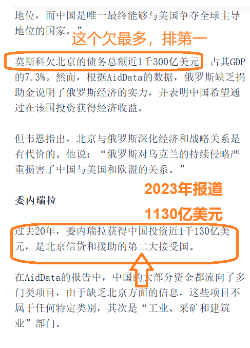 2023年的媒体报道,俄罗斯欠中国最多,1300亿美元