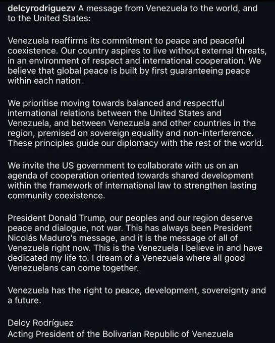 🚨 突发:委内瑞拉政权代理总统Delcy Rodriguez刚刚发布照片并发出信息: "我们邀请美国政府共同制定合作议程"