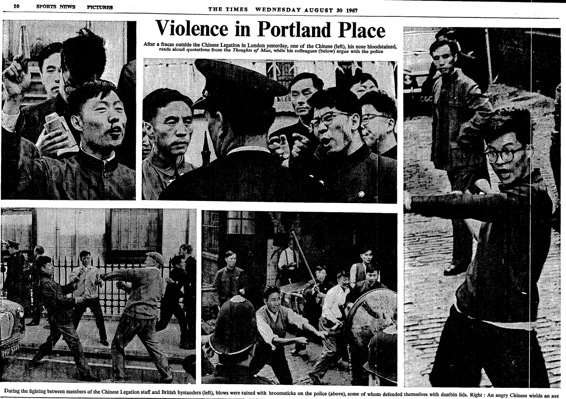 图1:1967年,周恩来接机被印尼政府驱逐出境的姚登山 图2:英国媒体报道称,中国外交官手持铁棍和瓶子攻击在中国驻英国大使馆后门等候的警察和媒体记者,这场冲突被历史性地称为 "德文郡街之战"。