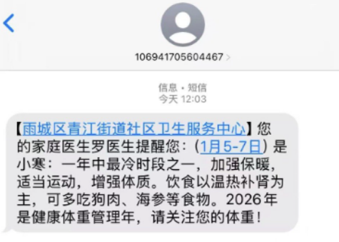 1月5日,有网友晒出了四川省雅安市雨城区青江街道社区卫生服务中心发送的一则短信。短信内容主要是健康提醒,其中写道:“小寒是一年中最冷时段之一,为加强保暖,适当运动,增强体质。饮食以温热补肾为主,可多吃狗肉、海参等食物。”