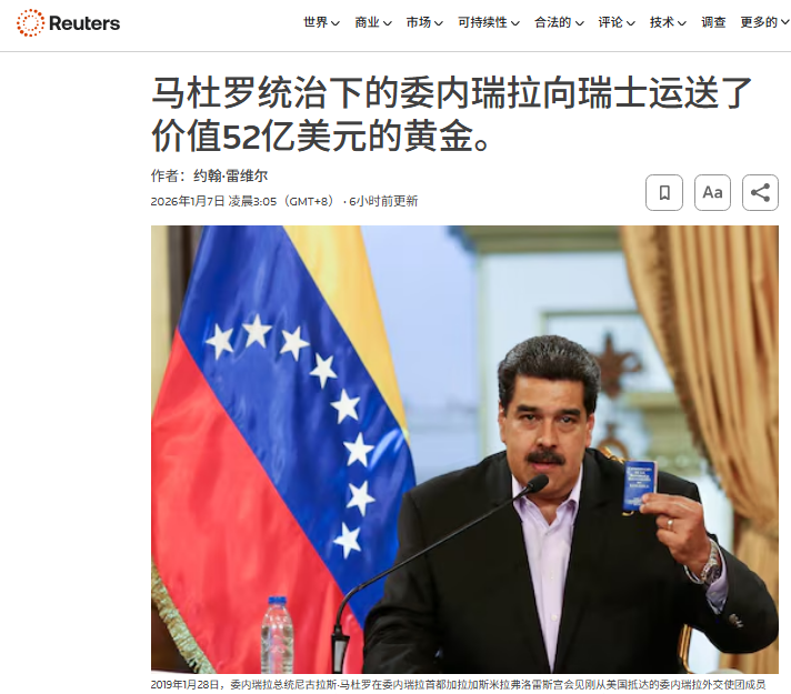 1月7日,据路透社报道,海关数据显示,委内瑞拉总统马杜罗执政初期,委内瑞拉向瑞士运送了价值近52亿美元的黄金。从2013年到2016年,该国向瑞士输送了113公吨黄金,来自委内瑞拉央行。当时政府正在出售黄金以支撑其经济。从2017年欧盟实施制裁到2025年,委内瑞拉未向瑞士出口黄金。