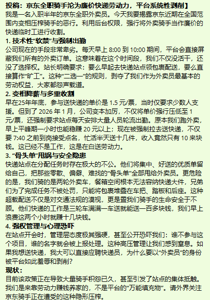 京东全职骑手沦为廉价快递劳动力,平台系统性剥削
