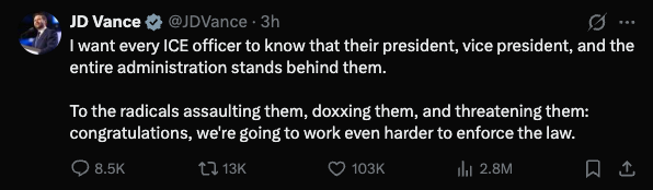 Trump,Vance,Noem都出來力挺ICE,明確表達被射殺女子是“用汽車作為武器”試圖衝撞ICE探員。可惜人是長了眼睛的。Trump和其inner circle選擇了最極端的立場,看這個立場能守住多少基本盤了。Maduro抓捕的國內好感這次要全部拜光還有多,很快就會反映在民調上。