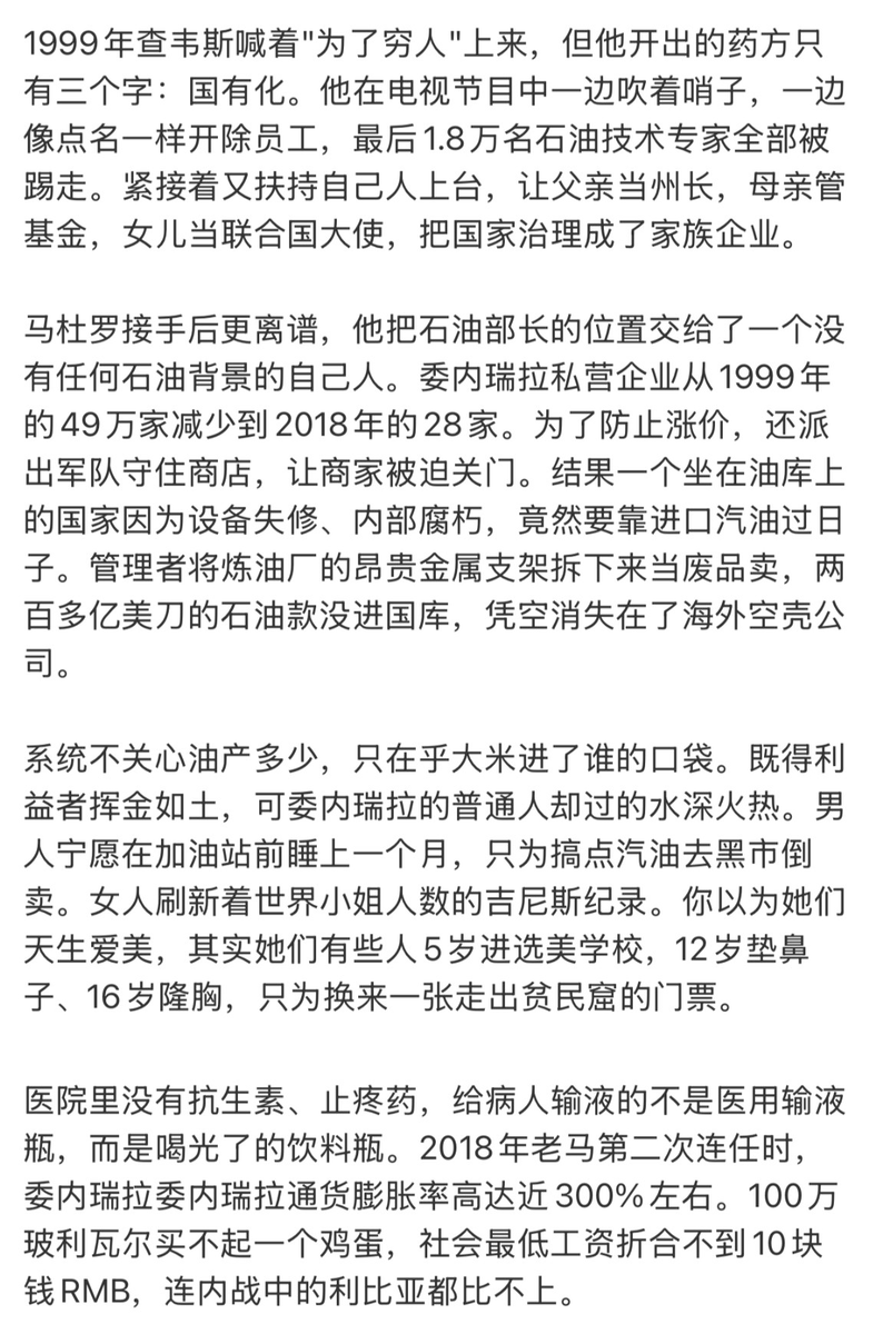 委内瑞拉作为传统发达国家,为什么几十年一过会穷成这样? 老夫的简述:国有化+(在仇外仇富的仇恨宣传下)夺取过多政治权力导致无法回复 夺权步骤很长,从制宪会议到驯服法院可以写一大堆,尤其是驯服法院,加上内外因素,比如油价高企令财政崩溃延后很久,导致整个流程没有受到很好的阻碍。 其实国有化导致经济崩溃中国人很有经验,写多了没意义。但政治上夺权我没有看见很好的作品。有的话我会转过来。
