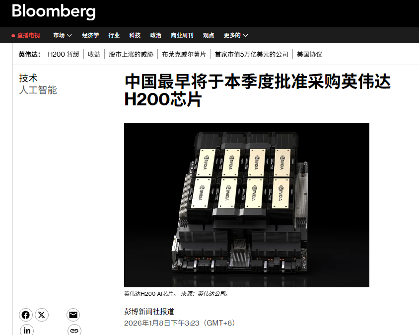 1月8日,据彭博社引述知情人士报道,中国官方正准备允许境内企业在商业领域使用 H200 晶片。 知情人士透露,出于安全考量,中国将不允许 H200 晶片用于军事用途、敏感政府部门及关键基础设施领域,这一做法与此前对苹果电子产品和美光晶片实施的相关限制措施相似。 消息人士还称,如上述受限机构确有使用需求,需逐项提出申请,主管部门将按个案进行审查并决定是否放行。