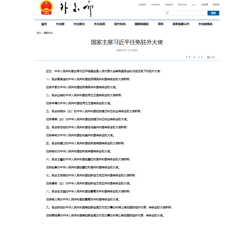 1月12日,据中国外交部消息,习近平根据全国人民代表大会常务委员会的决定任免下列驻外大使:
