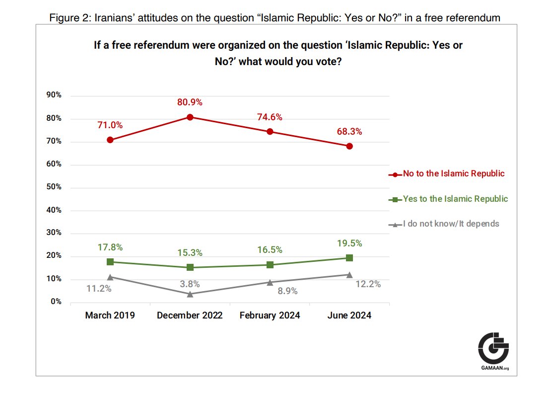 2024年6月,GAMAAN针对伊朗境内77216名受访者进行民调采样。经加权处理后,选取了有代表性的伊朗成年识字人口样本,有效样本量为20492人。其主要结果如下: