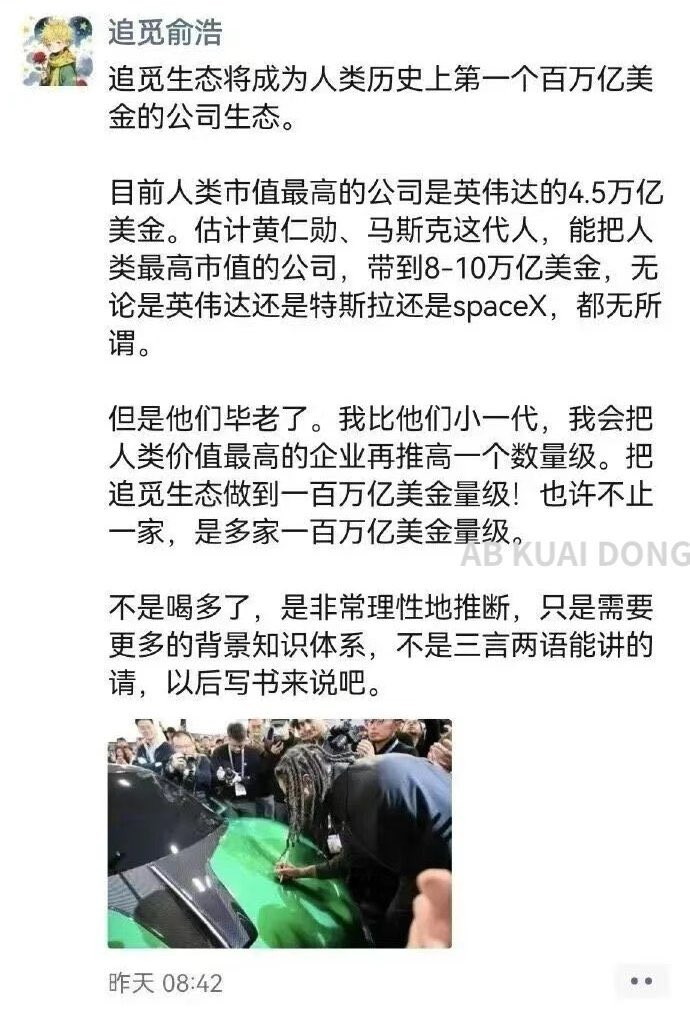 追觅科技老板俞浩在朋友圈吹牛,声称要将公司做到百万亿美元级别,不但超越英伟达、特斯拉,也超过美股市值总和 结果公司内部员工也看不下去了 该员工在 1066 人公司大群@自家老板,说他什么都不懂,然后同时@老板的支持者,说他是舔狗,只会无脑捧老板,到时公司会被美国罚得倾家荡产 打工人觉醒了,打工人估计也要开除了~~ 👇
