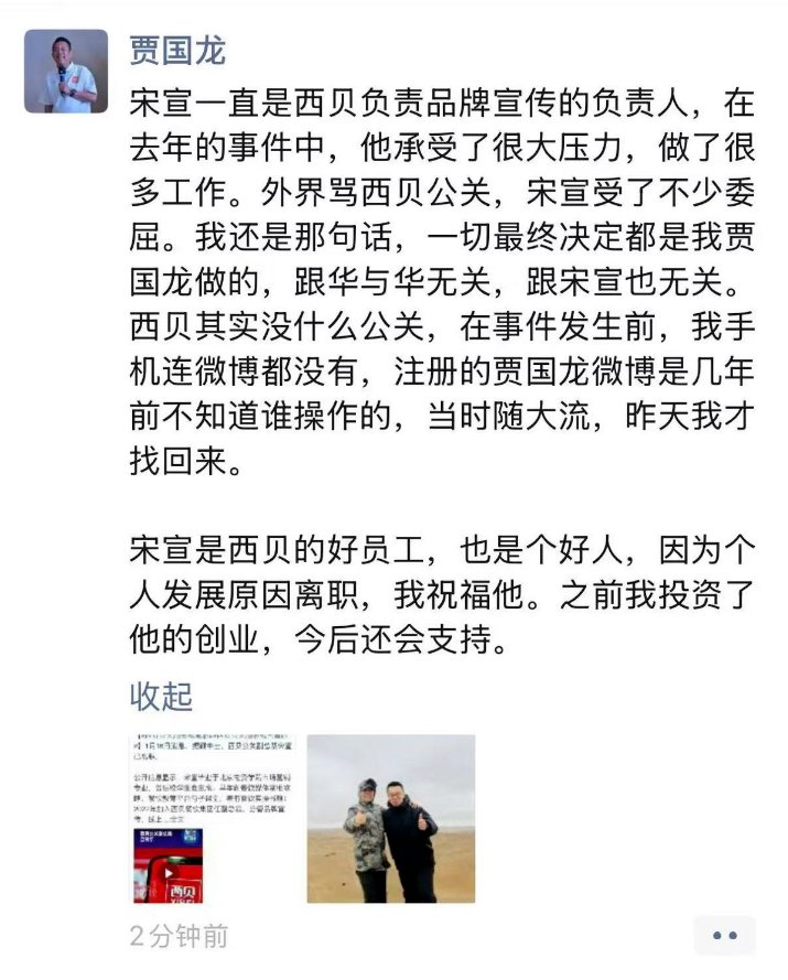 1月16日,西贝餐饮创始人贾国龙在个人朋友圈发文称,宋宣因为个人发展原因离职,“在去年的事件中,他承受了很大压力,做了很多工作。”