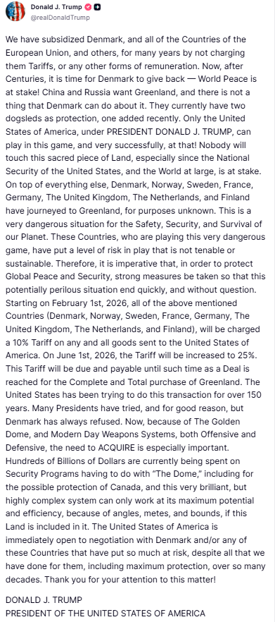 “川皇震怒,毋纵一卒”——特朗普对参加格陵兰军演的国家加征关税,哪怕某些国家其实只派了一两名参加:自2月1日起,丹麦、挪威、瑞典、法国、德国、英国、荷兰和芬兰向美国出口的所有商品将被征收10%的关税。6月1日起,关税将提高至25%。这些关税会在美国获得格陵兰后终止。