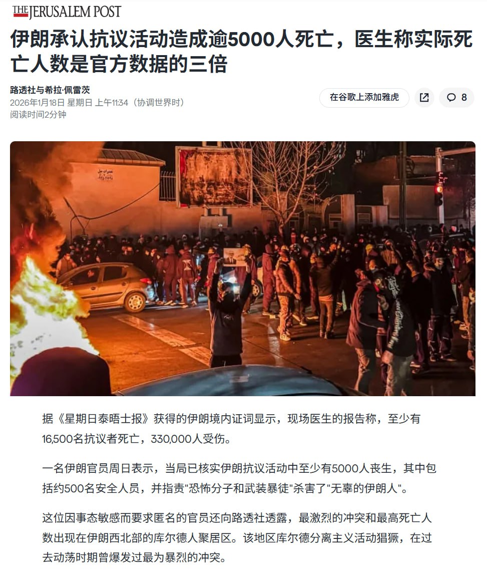 根据《星期日泰晤士报》报道,伊朗当地的医生报告称,至少有16,500名抗议者死亡,330,000人受伤,实际死亡人数是官方数据的三倍。
