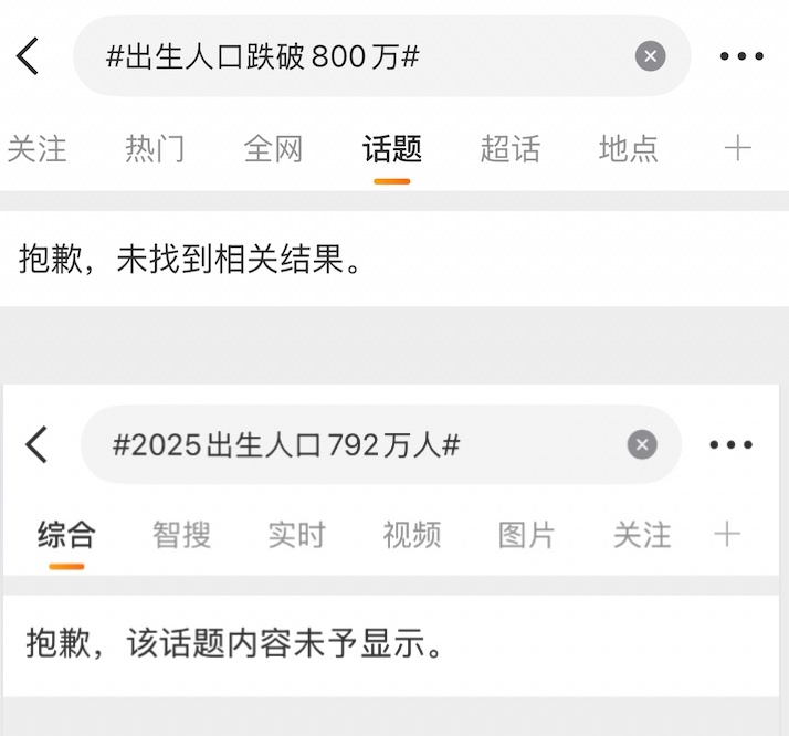 目前,“出生人口跌破800万”“2025年出生人口792万人”两个热搜词条已被微博屏蔽