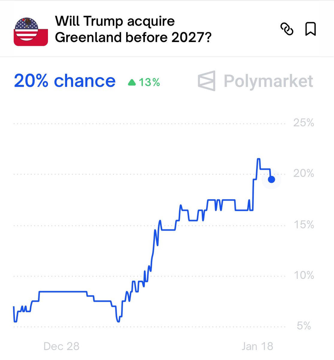押注市場認為川普今年拿到格林蘭島的機率為20%。