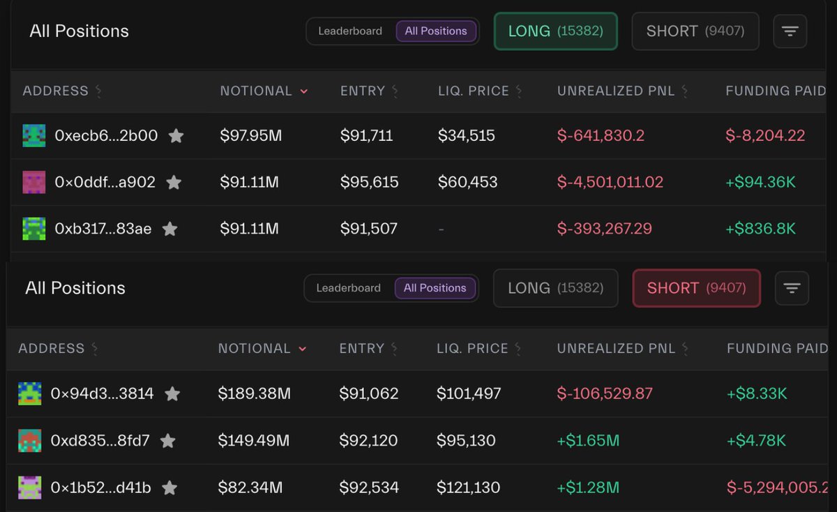 BTC 耗时一周冲刺 9.8w,再用一周跌回 9.1w —— 这行情开合约要么有钞能力,要么有大心脏统计了当前 Hyperliquid 热门的大额多空头寸(MM 除外),巨鲸们都在如何押注呢👇🟢 空军1️⃣ 地址 0x94d…33814- Hyperliquid BTC 空头 TOP1- 总持仓 4.48 亿美元,浮盈 432 万美元- 持有 1545 枚 BTC