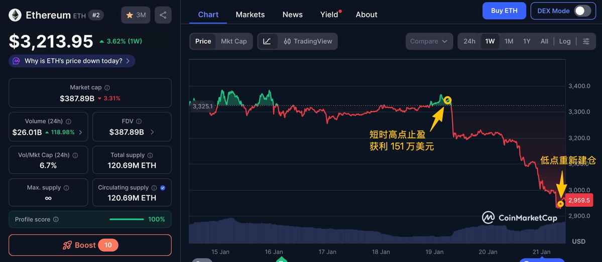 真准啊:$3,321 止盈,$2970 接回,怪不得靠 $ETH 波段能赚 9818 万美元🤩 波段巨鲸 0xFB7…5e0A3 在过去 8 小时 ETH 回调时,通过 Wintermute 和 FalxonX 建仓 20000 枚 ETH,价值 5940 万美元,建仓均价约 $2970;前天他才刚在较高点止盈并获利 151 万美元 钱包地址 https://t.co/cha5anhZte 本文由 @Gate_zh 赞助 |上 Gate App 抢黄金