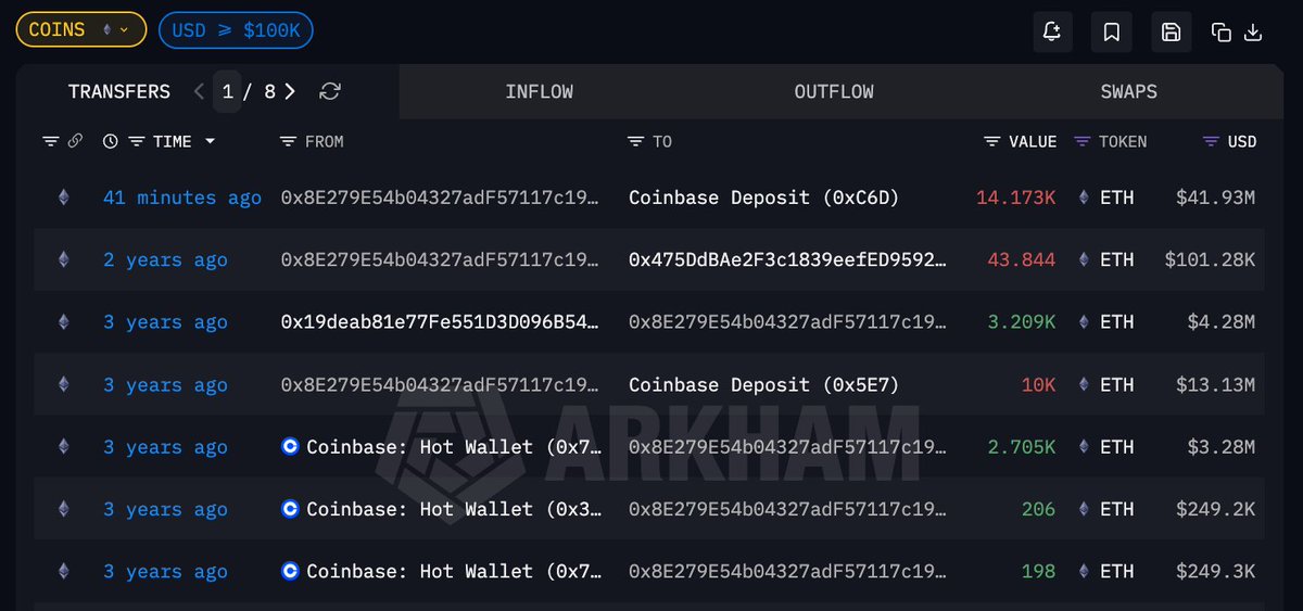 2016 年 $ETH OG 40 分钟前向 #Coinbase 充值 14183 ETH,价值 4193 万美元 —— 这是他时隔三年以来首次百万美金以上的 ETH 充值操作🧐该地址最近一次 ETH 疑似建仓已经是 2022.02-11,提币均价低至 $1236.65,而向前追溯他的 ETH 交易可以早至 2016 年钱包地址本文由