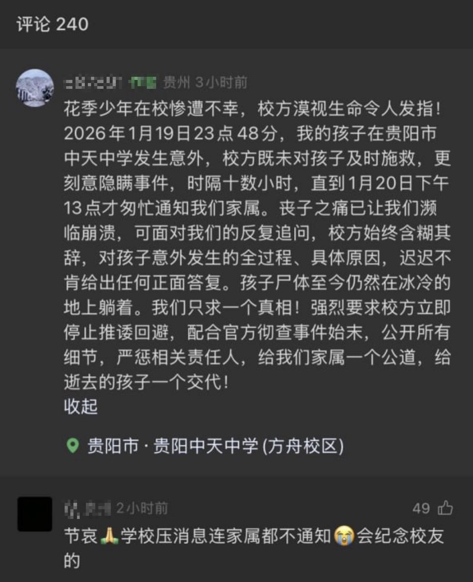 网友投稿:1月19日,贵阳中天中学,一学生跳楼。有知情者反映,事发当晚 23:48,一名学生从 10 楼跳下,校方未采取及时、有效的处置措施,刻意隐瞒消息,直到 次日下午 13:00 才通知家长。 校方随后封锁消息,对外以“水管爆裂”为由,禁止学生使用电梯、自习室,并封锁现场。部分知情学生接受老师的“教育”,并遭到斥责“不知其貌、胡乱评价”。 校方对于家长的追问,对学生发生意外的全过程、具体原因,迟迟未给出正面答复