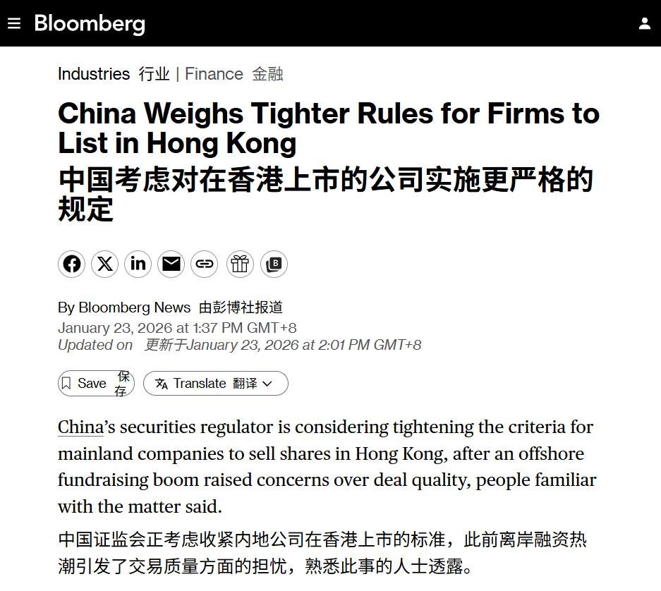 1月23日 — 彭博社援引知情人士消息报道,中国证券监督管理委员会(证监会)正考虑提高H股(内地公司在香港上市)企业的监管和合规门槛,包括拟设定最低市值限制。相关措施仍处于讨论阶段,尚未最终决定。