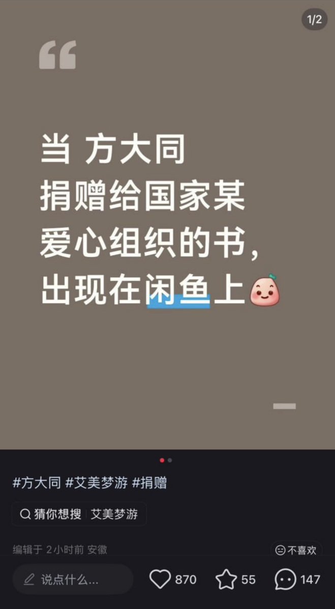 1月24日,有网友发现,方大同捐赠给国家爱心组织的书,出现在咸鱼上