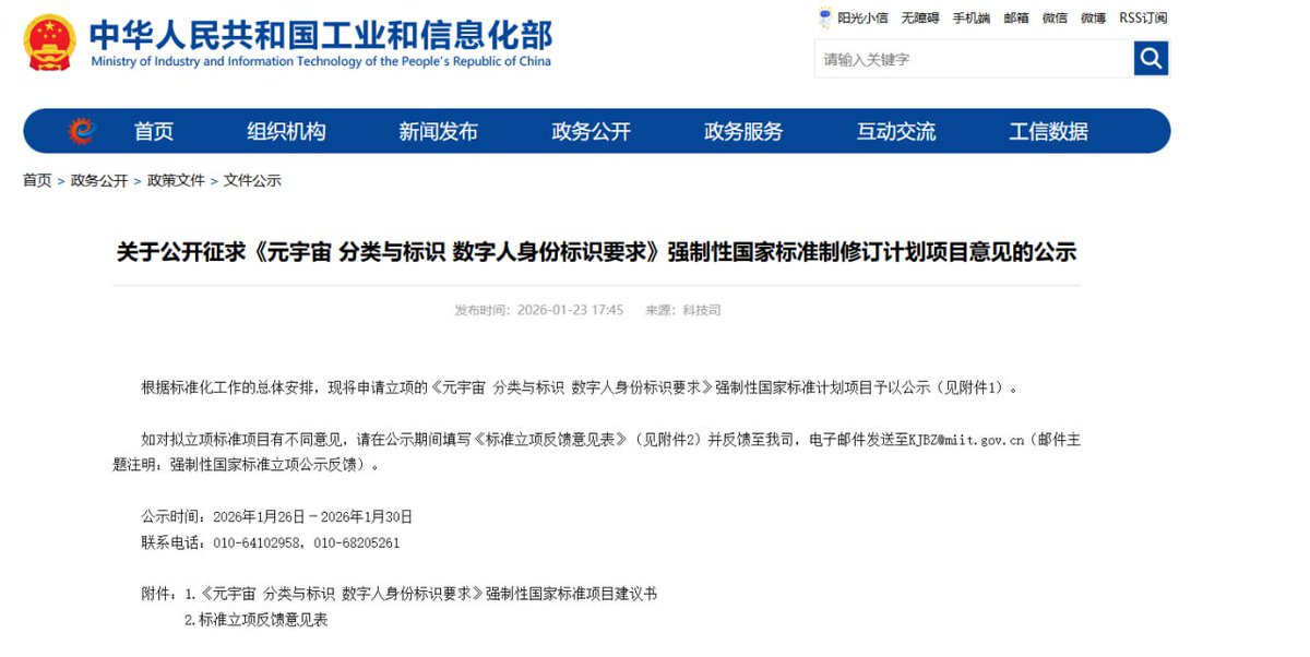 1月23日,工信部拟立项起草国标《元宇宙 数字人身份标识要求》。