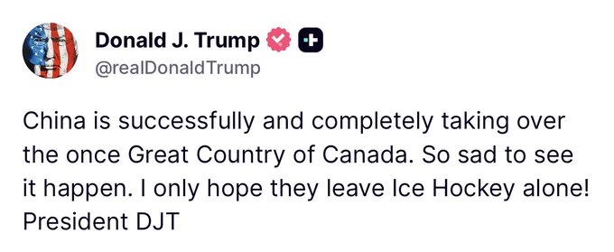 川普说中国正在成功且彻底地接管曾经伟大的加拿大。看到这种情况发生真是太悲哀了。我只希望他们别碰冰球!总统DJT