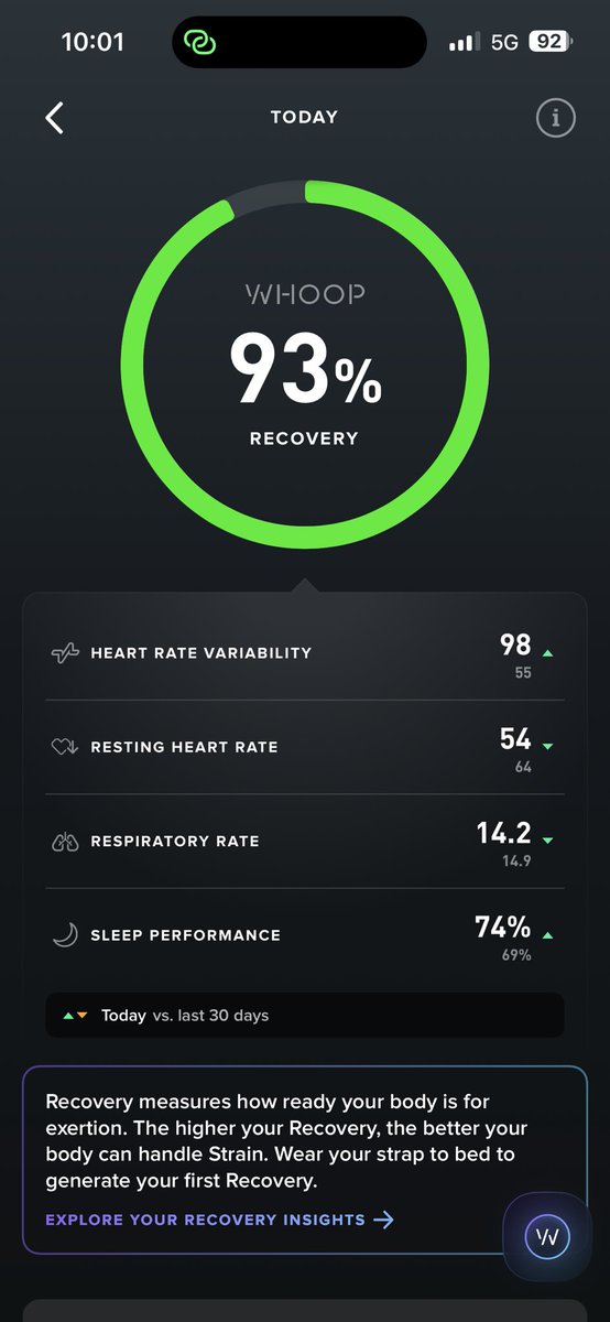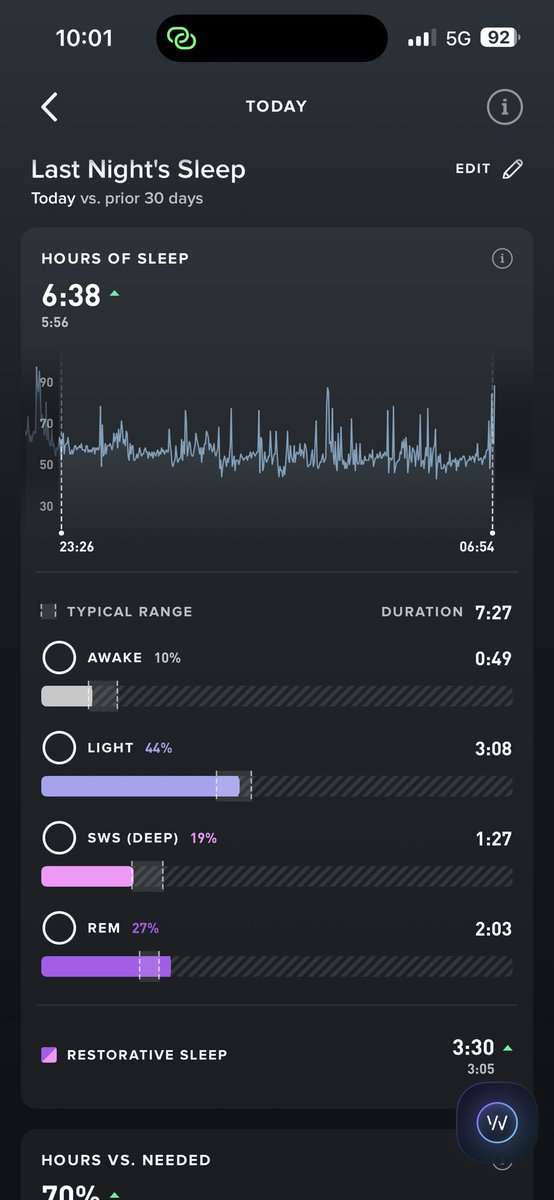 睡眠是我目前对于健康最关注的事情,我吃的所有补剂,饮食,床垫,温度,都为我的睡眠服务,其实我睡眠时间一直偏少,不过时间长短不是主要的,关注Recovery、HRV、RHR、Restorative Sleep指标质量更重要。