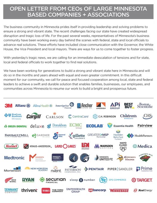 明尼苏达州多家顶级企业和职业体育队发表联合声明,呼吁"立即降级局势",并敦促各方"共同努力寻找真正的解决方案"。