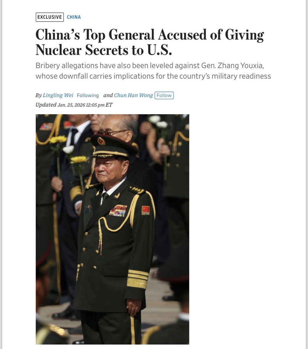 【核武器核心技术数据】🤷 清洗火箭军的起因当时说,是火箭军出卖情报,美国拿到了火箭军的序列、军队分布、各种武器的布置等,怎么没有把导弹的核心技术数据给对方呢 美国是不会关心你核武器咋造的,有没有技术改良,它更关心的是核力量的中长期规划、发射载具(陆基、海基)的进化等 《华尔街日报》被这么快定向喂料,说明他们需要迅速构筑不可反驳的罪名,将抓捕的理由做实,压住军内的愤懑与各种传言。同时在这些罪名上,对张又侠、刘振立派系进行收网调查。