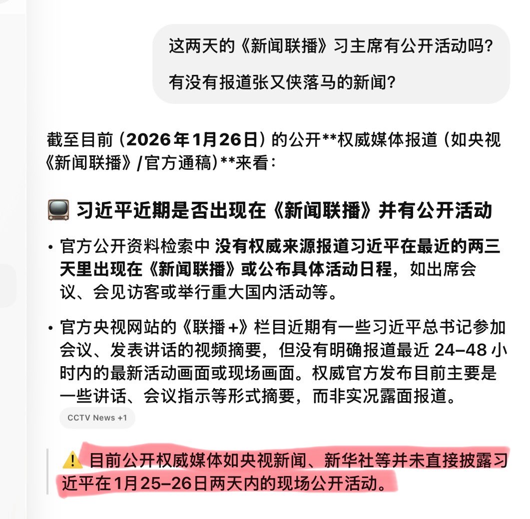 ⚠️ 目前公开权威媒体如央视新闻、新华社等并未直接披露习近平在1月25–26日两天内的现场公开活动‼️