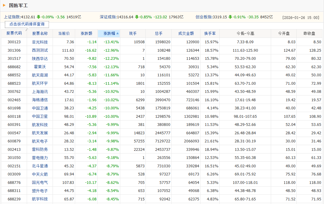1月26日,股市场军工板块集体下跌,多只股票跌停。
