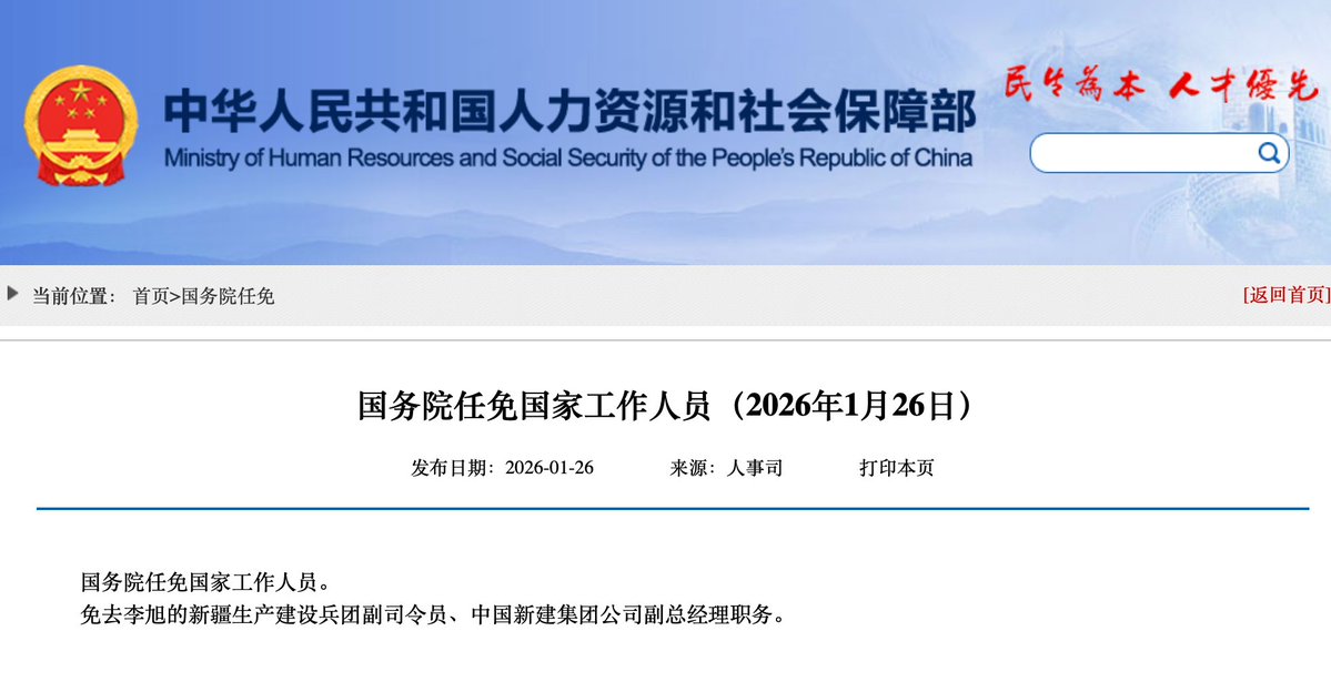 1月26日,据人社部消息,国务院任免国家工作人员。