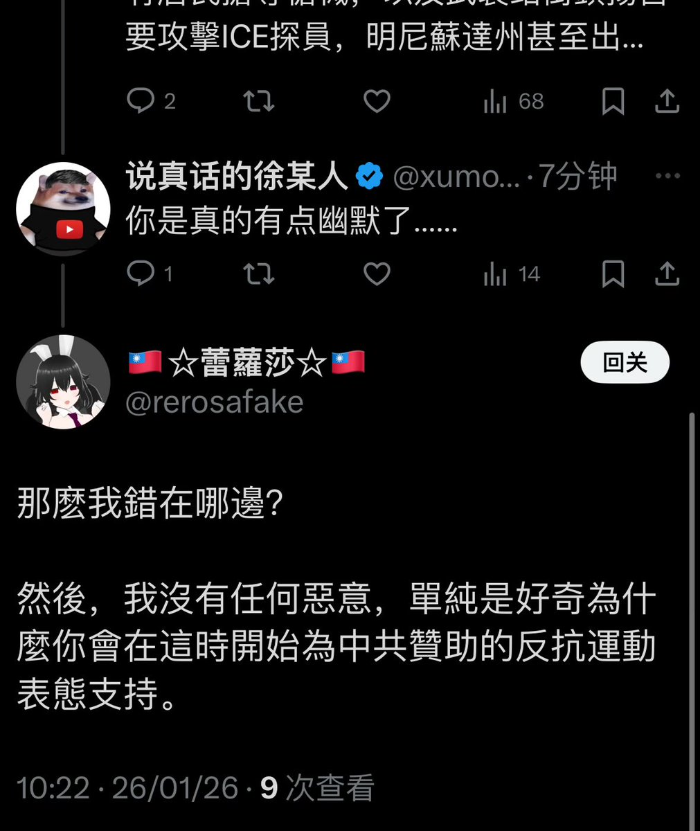 我不是这时候开始对你所谓的“中国赞助的反抗运动表态支持”,我是从起号第一天就支持处于弱势的人们反抗暴政,无论弱小的那一方是被压迫的中国人、是台湾、是乌克兰、是伊朗人,还是那些走上街头的美国抗议者。