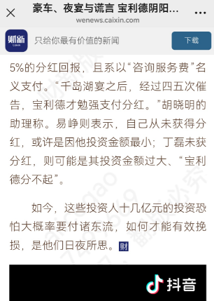 1月23日,财新刊发深度报道《豪车、夜宴与谎言 宝利德阴阳账本套牢浙商老钱新贵》,剖析了华东头部豪车经销商宝利德控股集团有限公司在引入多位知名投资人、数次冲刺IPO背景下,仍突然暴雷、濒临破产的原因。
