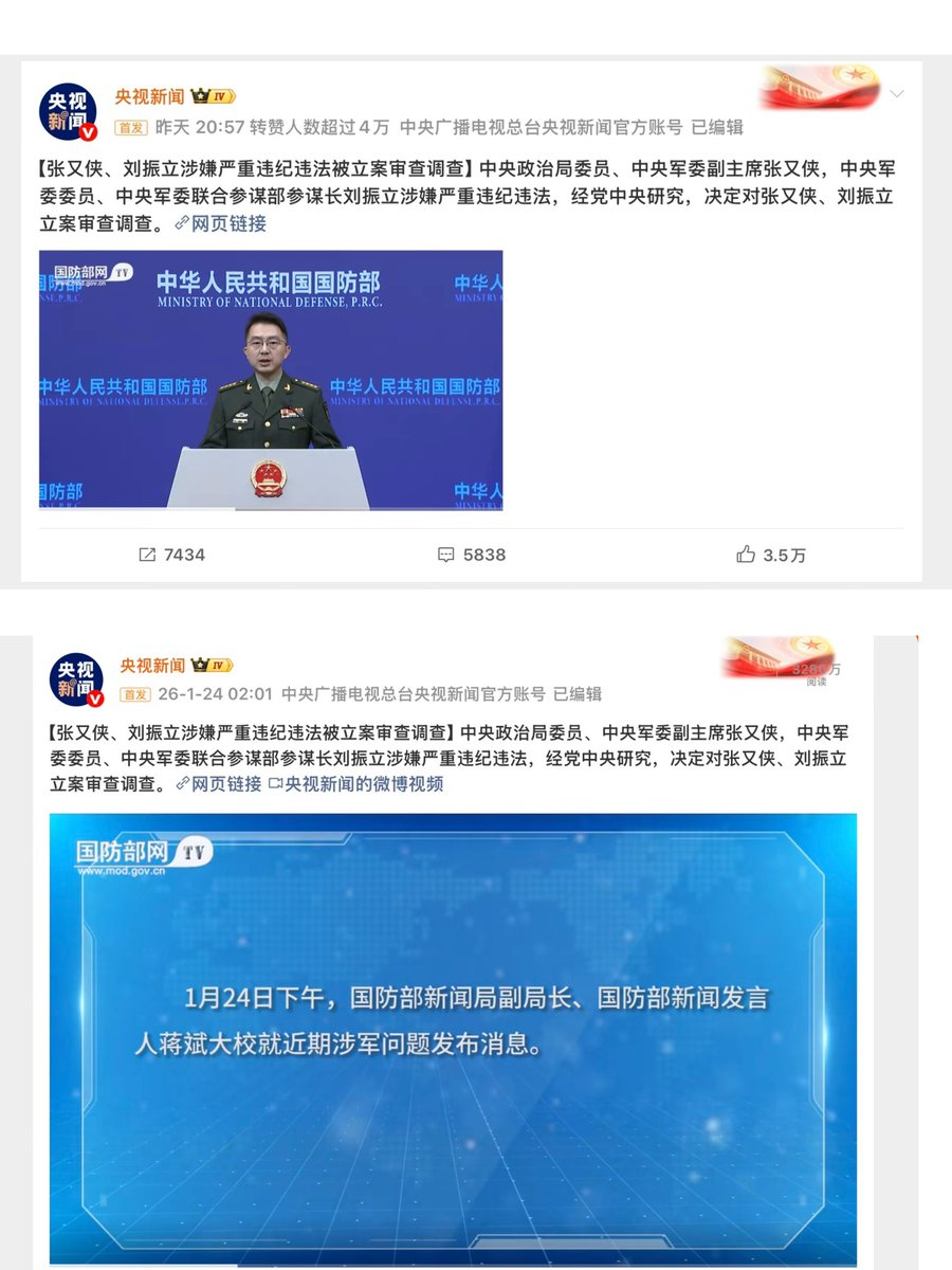 新华社8小时前发的微博,内容还是张又侠1月24日的落马通报