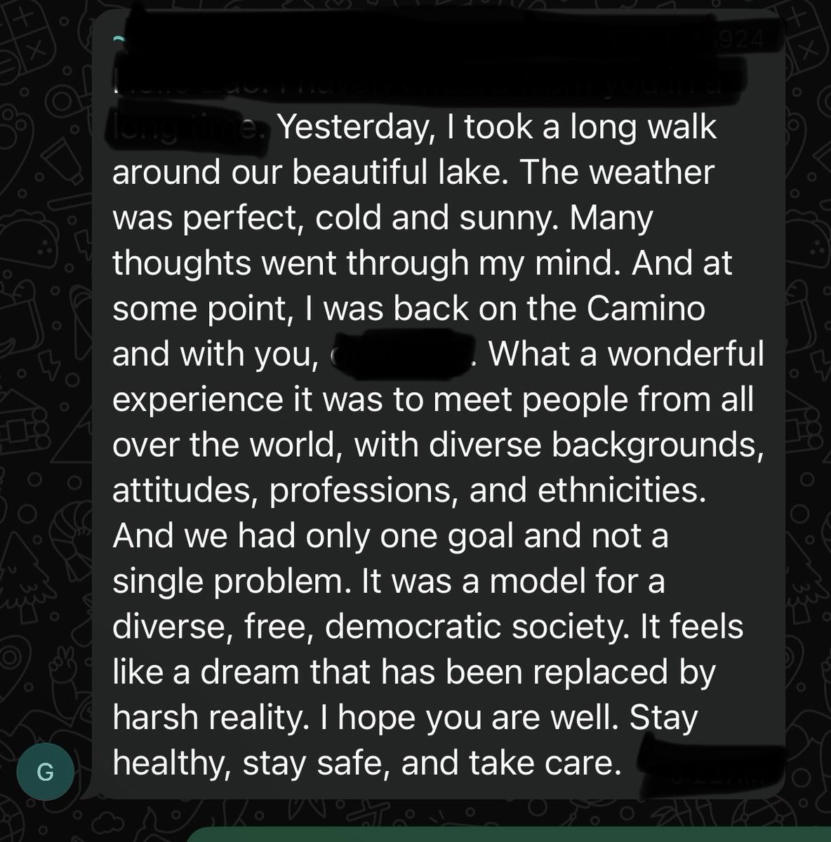 昨天收到远在德国的朋友来信和一张老照片。读完令人感动,也令人唏嘘。我们曾一起走过圣雅各之路。几年前,我骑车穿越欧洲时,曾在他家小住。他看到ICE在明尼苏达街头杀人的景象,良知受到剧烈冲击,惦记远方的朋友。虽说人生都是萍水相逢,但在这个杂种横行的时段,来自远方的友情让人感到人间温暖。