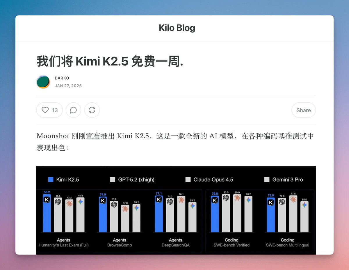 Kilo Code 免费提供 Kimi K2.5 一周🥳