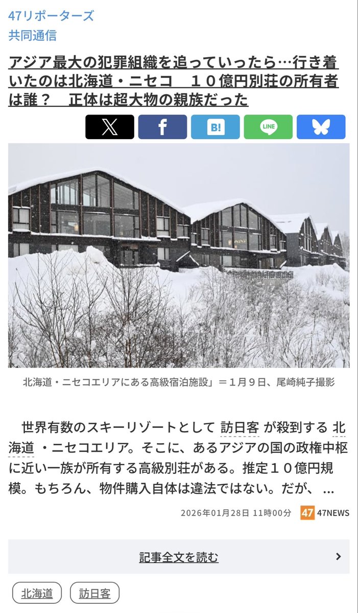 最近,簡中SNS上,北海道已被塑造成「斬殺」中國人的不安全地,大雪、車禍屢見不鮮。然而日媒發現,前不久被拘回國的東南亞詐騙教父、被美國沒收150億💲比特幣的男人,也持有大量房產,記者們還順藤摸瓜,發現了北海道二世谷10億円的渡假別莊背後的主人—柬埔寨洪森家族的千金。