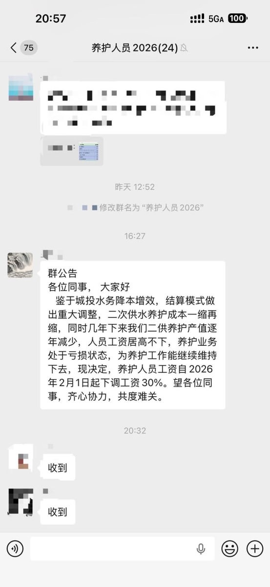 1月27日,上海,一名城投系水务公司员工发帖,公司单方面决定将养护人员工资自2月1日起下调30%,理由是二次供水养护成本持续下降、业务产值逐年减少,公司称希望通过降薪降低亏损。