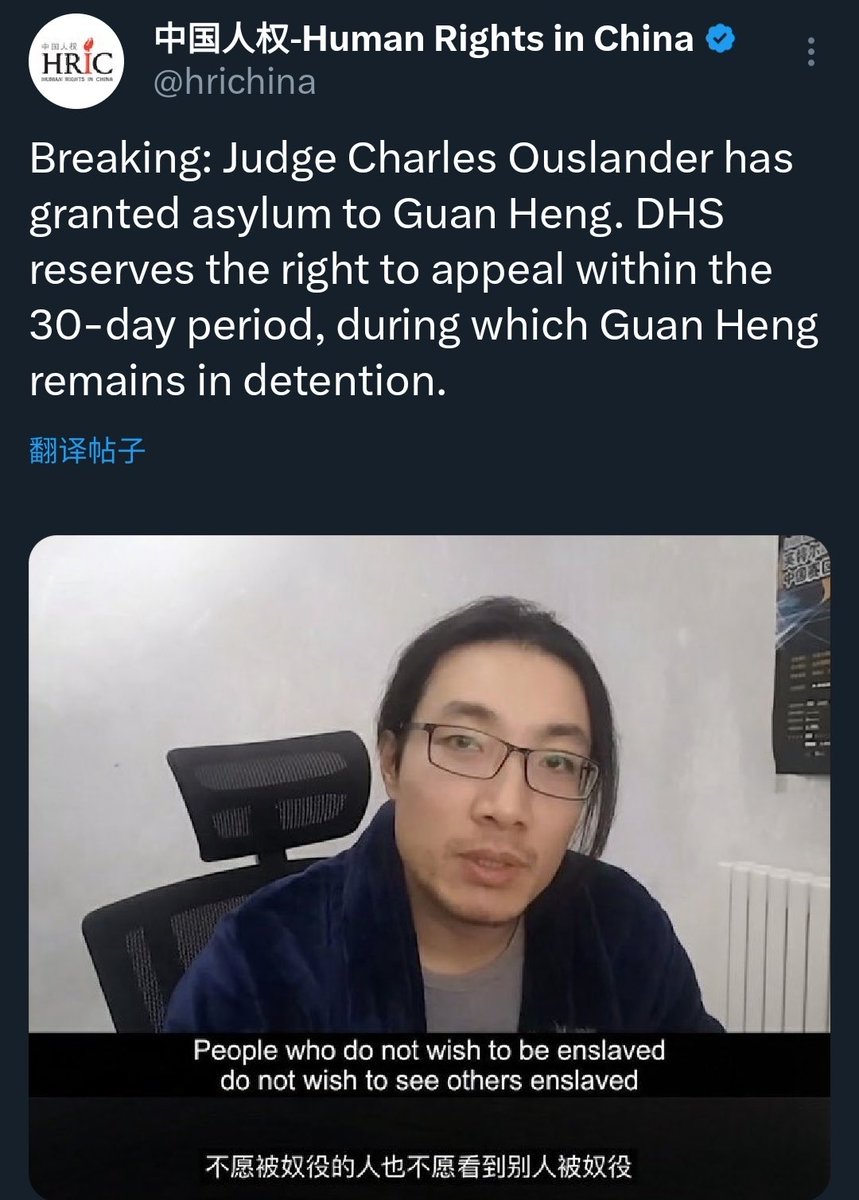 邪恶👿又一次赢了!法官批准了关恒庇护。这下做庇护的周君红的老板陈闯创等又要笑死了。打开新思路,人人都去自拍一点监狱外面的视频,让中共顺着这个思路继续送中共间谍进美国吧!川普政府不是已经停止庇护申请了吗? 看样子依然无法阻止州的我行我素。