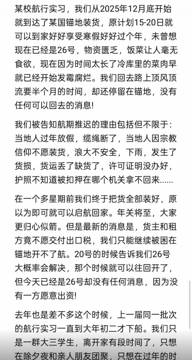 #赛博信访局网友投稿:上海海事大学航行实习学生滞留海外锚地超30天,因出口税纠纷迟迟无法启航返航。滞留期间,家长曾向相关方面反映情况,却毫无作用。