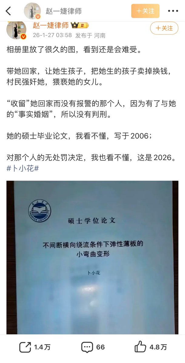 1月27日,一律师评“ #女硕士失踪生子孩子父亲不构成强奸罪”: 带她回家,让她生孩子,把她生的孩子卖掉换钱,村民强奸她,猥亵她的女儿。 “收留”她回家而没有报警的那个人,因为有了与她的“事实婚姻””,所以没有判刑。 她的硕士毕业论文,我看不懂,写于2006; 对那个人的无处罚决定,我也看不懂,这是2026。