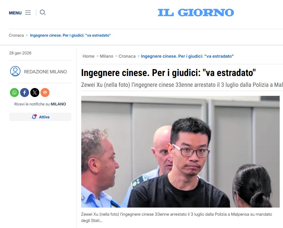 前天,意大利米兰上诉法院裁定33岁的中国工程师徐泽伟(如图)必须被引渡至美国受审。上诉法院宣布徐泽伟“符合美国引渡请求的条件”。徐泽伟于7月3日在意大利Malpensa机场被警方根据美国逮捕令逮捕。 徐泽伟声称自己是在和妻子一起到意大利度假时被捕的。他已被拘留近七个月,并被美国指控犯有多项重罪。