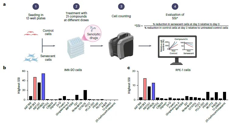 研究结果表明,BCL-2抑制剂ABT263和BET抑制剂ARV825效果最为显著。它们能在不影响正常细胞存活的前提下,最高效、特异地清除衰老细胞。