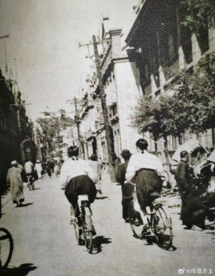 这是1942年的某一天,在我家乡烟台市区的大街上,两位骑自行车的姑娘背影。