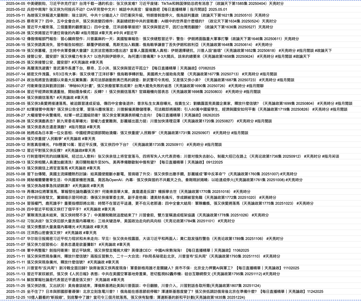 章天亮老师表示自己很委屈,因为自己一直在质疑和否定张又侠夺权说,2025年章老师的所有关于章天亮节目列表如下,如果你只看标题,很难分辨他和江峰大宇有啥区别,但是仔细看,你会明白章老师操作更加精细,大家能不能看出来呢?