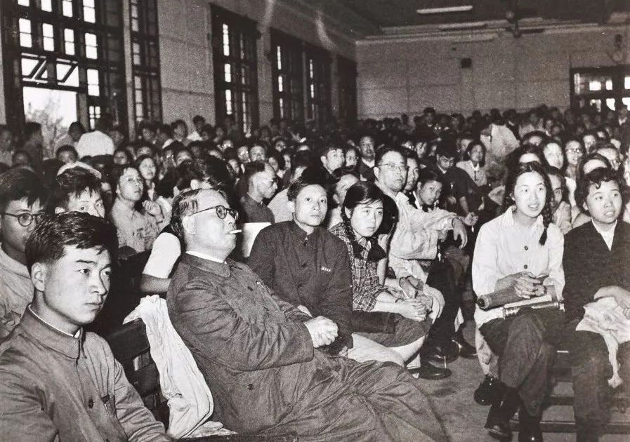 1957 年 7 月 3 日复旦大学批判会现场,戴眼镜者为王造时。 照片上,王造时的表情令人过目难忘:他身穿中山装,脚蹬雨靴,叼着香烟,左手紧握右手,跷着二郎腿,一副满不在乎的样子;一旁的长椅上,放着一只皮质公文包。围坐一旁的师生,也穿着雨靴,大多呈义愤填膺之色 ; 唯有右侧一位扎辫子的姑娘,脸带一丝轻松的微笑……这张照片,生动传神,故事性强,是当年解放日报摄影记者抓拍的现场画面。