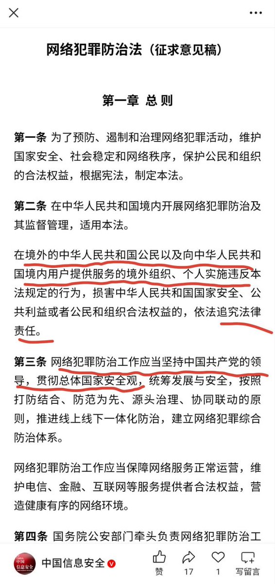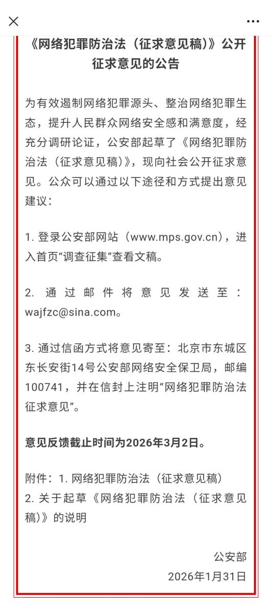 网友投稿:1月31日,中国公安部布了“网络安全防治法(意见征求稿)”公开征求意见,里面写有大量离谱内容,如强调中共的领导,贯彻总体安全观;强调此法适用于全体中共国公民和境外公民,违反会被追究责任;强调网络实名制,不能用虚假身份信息注册互联网服务,不能无正当理由持有非本人账号,不能解封已经被封禁的账号;切换虚拟网络定位功能的要报备;传播官方不认可的信息,损害国家主权及利益的,境内人员违反会被边控,境外人员违反会被经济制裁及限制入境。