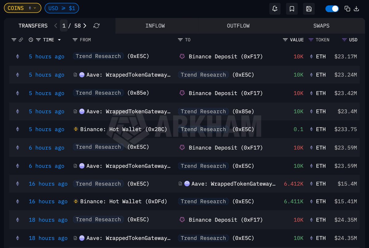 Trend Research 过去 24 小时已累计向交易所充值 4 万枚 ETH,若卖出将亏损 2964 万美元👀