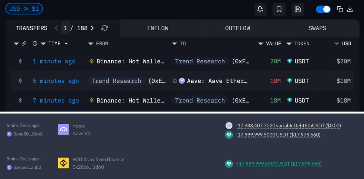 更新:过去 7 分钟 Trend Research 从 #Binance 提出 3800 万枚 USDT ,随后充值进 Aave 偿还借款